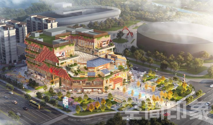 我们在烟台福山,设计了一个装在盒子里的山丘小镇,以当地特色的民俗“耍山”、“入夼”、“赶大集”为主要设计灵感来源,将“青山、村落、流水、田园”的自然格局作为建筑设计基调,融入局部情景元素,如树林石阵、山谷步道、潺潺泉水,与整体动线进行结合串联。融情于景,打造全新的山系体验空间,沉浸式享受逛游山场的乐趣,在市井烟火中寻找诗和远方。
