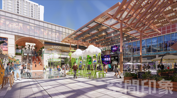 拥有两个主入口的BBS区域,以零售、餐饮、轻咖、休闲社交为主,为营造松弛感、休闲的院落式商业空间,将采光顶结构装饰化,钢结构廊架铺顶,保留一定的自然光线基础上起到遮阳作用,交错层叠的形态结构增强视觉冲击力,提高商业氛围。