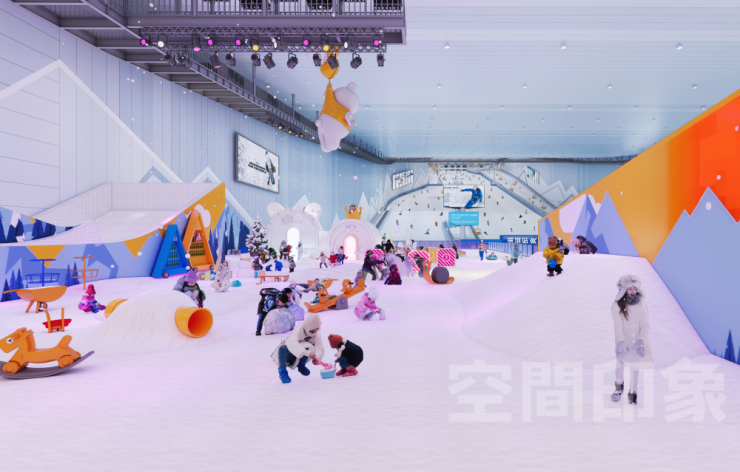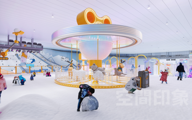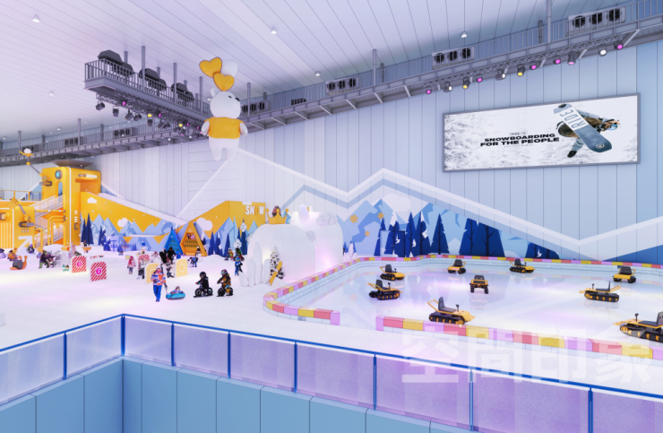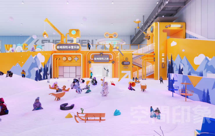 乐园以明快的黄、蓝两色为主色调,勾勒出活泼且富有层次感的空间格局。搭配蓝色雪山、森林装饰,辅以定时飘雪装置与浪漫灯效,既精准呼应冰雪主题,又借色彩巧筑温暖欢快的氛围,巧妙打破冰雪空间固有的冷冽感。