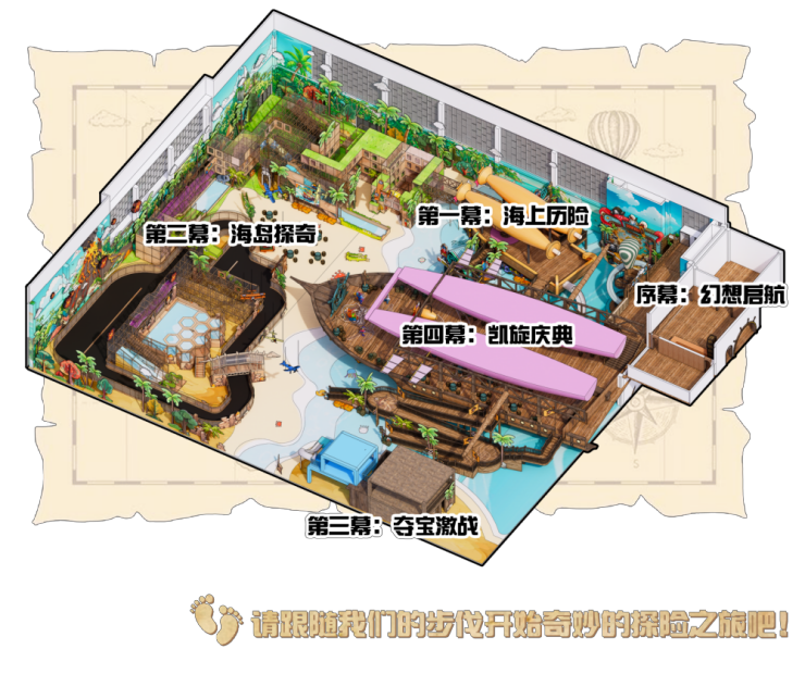 为了冲出室内乐园市场的重围,我们致力于以“四维沉浸”驱动消费增长,通过空间情景化重构+内容剧情化升级+运营戏剧化演艺,让内容与场景彼此加乘、互相成就,将传统游乐场进化为“孩子可欢乐、家长可参与、商业可持续”亲子共演共乐互动沉浸游玩生态,打造全天候、全客层、多感官的海盗航海冒险主题•互动式剧场式室内乐园。