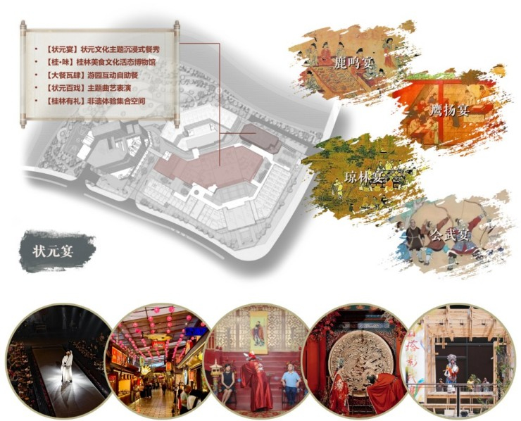 以科举四宴“鹿鸣宴、鹰扬宴、琼林宴、会武宴”为空间叙事逻辑,让状元文化贯穿整个街区,融入状元主题沉浸式餐秀、广西美食、游园餐会等沉浸式、互动型的美食演艺聚场,游客在游逛间享受特色美食的同时,感受状元文化的魅力。
