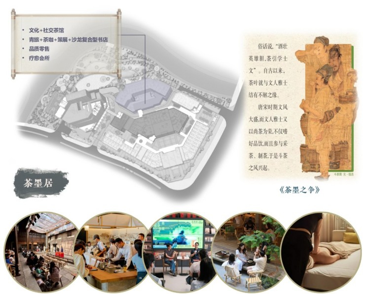 俗话说,“酒壮英雄胆,茶饮学仕文”,唐宋时期,斗茶之风盛行于文人雅士间,苏轼与司马光的“茶墨之争”更是文人与茶文化间的历史佳话,我们便借此佳话打造【茶墨居】,引入多元化社交业态。