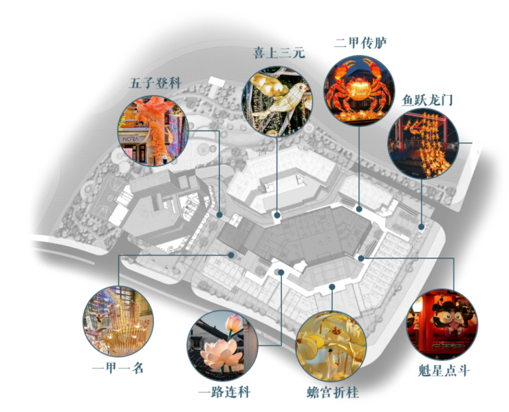 从文化符号提炼到空间设计,我们实现了“形”与“意”的双重融合。用“鱼跃龙门”“蟾宫折桂”“魁星点斗”等八大节点结构科举文化,营造街区独特的状元文化氛围,形成多个网红打卡点,满足消费者打卡、出片、传播的需求。