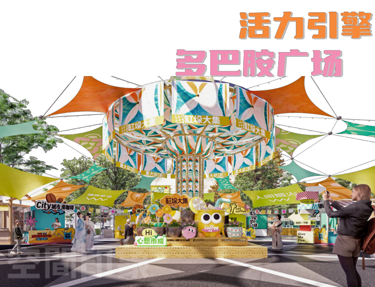作为精神地标,多巴胺广场以活力色彩与轻质灵活的装置结构为特色,顶部以橙、绿、蓝等“多巴胺色彩”的彩旗围合形成艺术天幕,搭配金色轻质支架,与原木质感的基座形成温暖呼应。周边点缀着卡通水缸、花艺摆件、缸体盆栽等趣味元素,营造出轻松松弛的社交氛围,是文化展示、休闲打卡、人群聚合的核心空间。