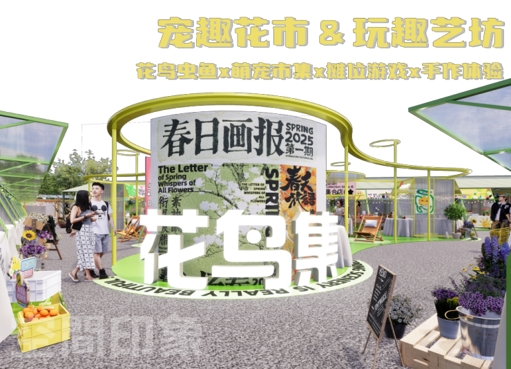 宠趣花市&玩趣艺坊采用环形与线性结合的流线设计,清新的黄绿色调搭配潮流平面元素,点缀有粉色花朵、春日画报等巨物化装置,周边散落木质花架与鲜花盆栽,强化花鸟集市的治愈氛围,让人与宠物、花草在此共享悠闲时光。