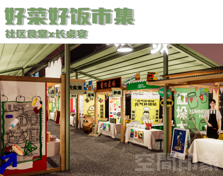 好菜好饭市集围绕“美食+轻社交”的年轻向美食场景,以长桌宴为灵感,布置透光顶棚的室内长形空间,卡通插画、趣味标语点缀其中,可爱温馨的氛围包裹着每一位食客,传递着“好好吃饭”的生活理念,让大集贴近日常,成为邻里闲话家常、温暖互动的温馨角落。