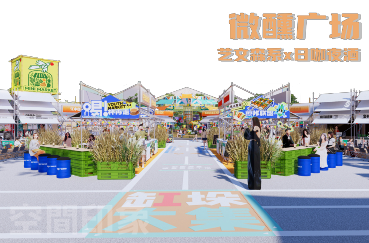 微醺广场档口区,菜筐、油桶改造的桌椅与芦苇类绿植穿插其间,让野趣自然的松弛感与市井烟火气相融。框架结构与自然元素的碰撞,烘托出轻松热闹的微醺市集氛围。