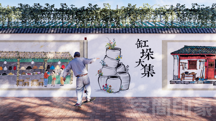 两条国风美学对角线贯穿大集——“一条故宫绛雪红,一条国风琉璃绿”,搭配以“缸”为原型的景观小品,让文化符号融入每一步风景,形成统一又独特的视觉识别系统,引领人们在色彩与光影中邂逅烟火与风物。