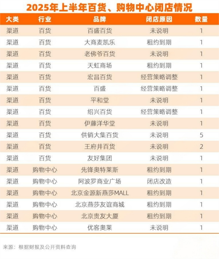 据统计,2025年上半年,全国至少有23家百货、购物中心关闭。关闭的门店中,运营时间最久的是长沙阿波罗商业广场,这家1998年开业的百货门店,已经运营27年;开业时间最短的则是成都优客奥莱科华店,门店仅开业一年就宣布关闭。(数据来源:壹览商业)