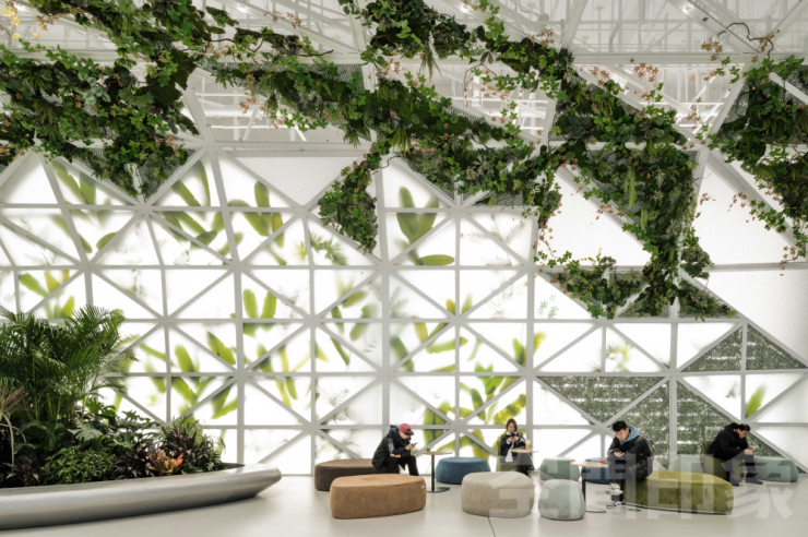 可移动装置、模块化构建、轻量化材料,仅用金属网、钢结构、素水泥、木材打造极简空间,商户用绿植与艺术装置填充“空白”,大幅降低了未来空间更新迭代的硬件成本与时间周期,空间不再是一尘不变的死板空间,而是具备可塑性的流动舞台。