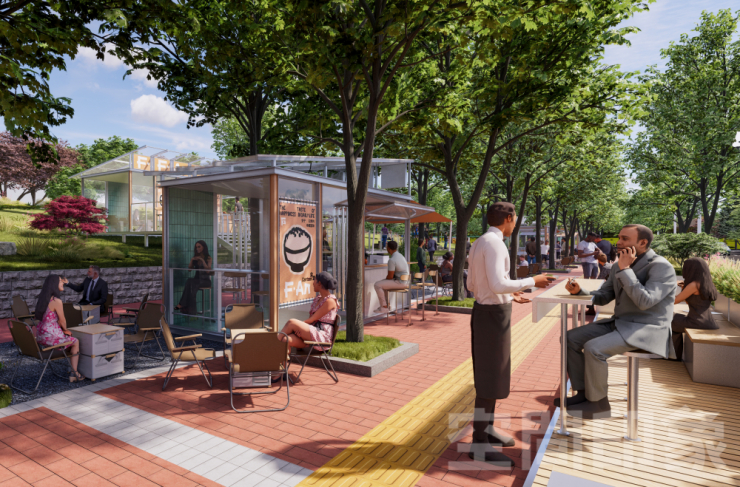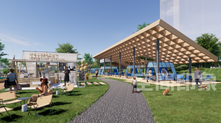 公园商业的设计也进入了全新版本,设计主张“轻介入”,传统售卖亭正转变为可移动、易组装的设施单元,最大限度地减少对自然环境的干扰,同时灵活响应多样化的活动需求,减少建筑对自然景观的遮挡,达成“商业从自然中生长”的空间效果。