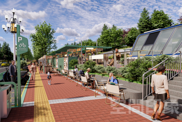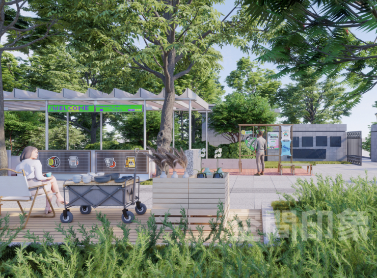 我们将医院周边、地铁口旁的沿街灰空间,改造为轻量商亭集群+阶梯式休憩看台,以现有的乔木为骨架,搭配高低错落的生态草坡、花境植被,把原本单调的步行道,打造成“林下漫游林径”,让逛街如同逛城市公园,天然降温又治愈。