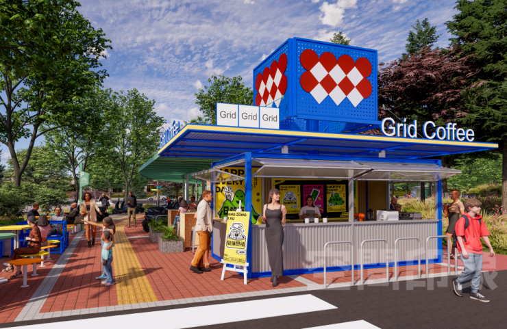 商亭轻盈通透,与自然、文化装置和谐共生,同时兼具“移动展柜”的功能,既承载餐饮、零售等基础商业功能,又可快速切换为艺术装置、快闪展览的载体,让街区的文化属性与商业价值形成良性循环。