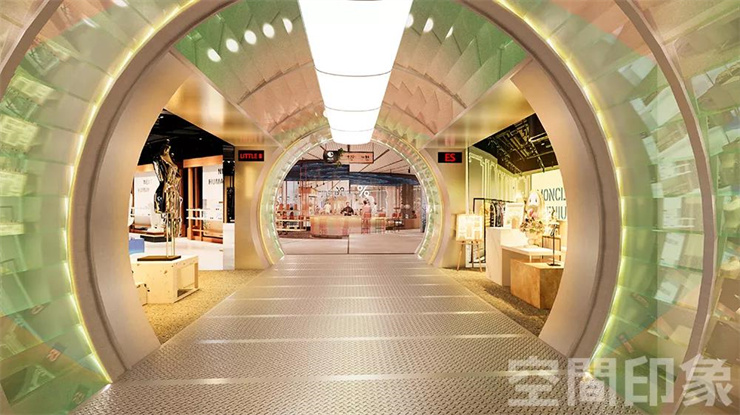 入口是一个有着神秘力量的“传送门”,是进入神秘地下城的结界。立柱被覆以电子屏,光影流动,人们将被神秘的光柱吸引,然后步入一片电路板模样的迷阵,地下城正朝你敞开一个大口,让你不禁窥视那隐藏在地下的世界。