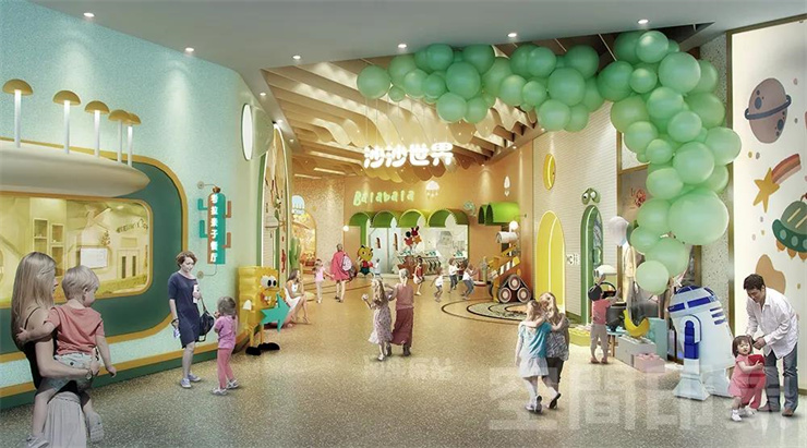提取火星表层的沙漠、山丘、砾石、登陆舱等元素打造的沙沙世界以儿童零售、儿童教培、亲子餐厅等儿童业态为主,结合星球元素与马卡龙色彩,为小朋友创造一个天马行空的童趣化空间。