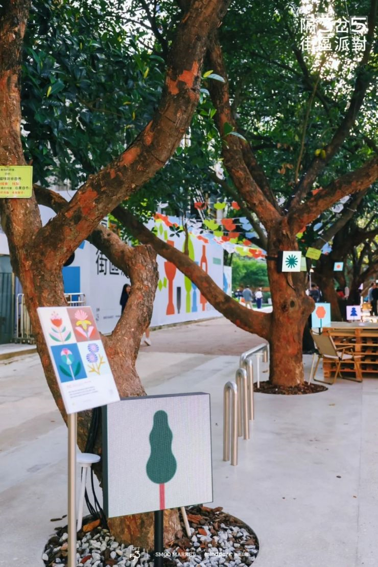 街区内没有刻意设置的大型网红装置吸引眼球,而是基于售卖和社交功能,增加了留言墙、平衡洞洞板游戏、树陈LED艺术装置、小彩旗等营造街区氛围,留出更多的空间打造视觉通透的感觉,也为后期社群活动提供更大的空间。