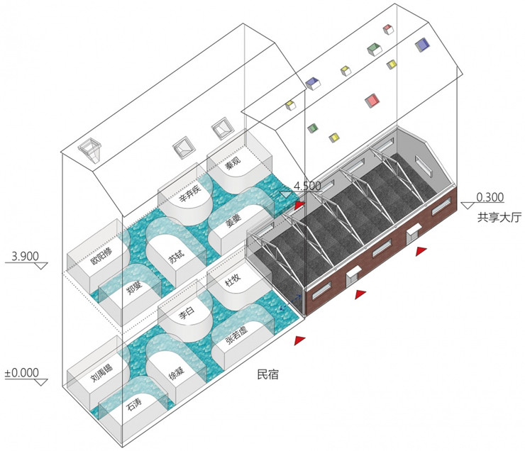 新华书店的后场两栋小楼被改建成民宿和共享大厅。其中两层楼的小楼设计了12间客房。这就是民宿盒子。牺牲了一部分客房面积,把客房独立成附着在大盒子里的小盒子。你打开这个大盒子,拿到的可能是李白,或者是欧阳修,一开始你无法确定会是谁,毕竟有12个诗人在等着你挑选。